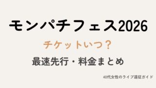 フェス モンパチフェス2026チケットいつ?最速先行の申し込み方法・料金まとめ モンパチフェス2026のチケット先行はいつ?最速先行の受付期間、チケット料金、早割の違い、小学生や未就学児の料金についてわかりやすくまとめました。モンパチフェスが初めての方にも参考になる内容です。 2026.03.10 フェスモンパチフェス推し活・ライブ